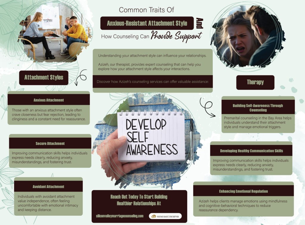 Exploring Attachment Styles: A Guide to Healthier Relationships # Infographic, Silicon Valley Sep 12, 2024 Facebook Instagram Linkedin X-twitter Understanding your attachment style can influence your relationships. Azizeh, our therapist, provides expert counseling that can help you explore how your attachment style affects your interaction. Related Articles Why Nothing Changes Even After You’ve Said It a Hundred Times 10 Essential Skills That Build Deeper Intimacy in Marriage Understanding Porn Addiction: Its Causes, Impacts, and the Path to Healing
